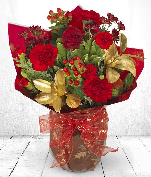 A stunning red and gold hand-tied bouquet, tied with a festive bow. Red roses, carnations, hypericum and chrysanthemum are perfectly accented by gold and green seasonal foliage. Lovingly created by a local florist and delivered by hand, this bouquet is a beautiful way to send the very best of the season. Product Ref: BOU17_112