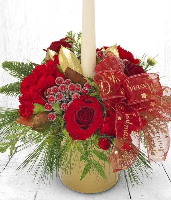 A stunning red and gold Christmas candle arrangement. Red roses, carnations, chrysanthemums, a festive bow, and green and gold seasonal foliage surround a white candle, to create this gorgeous design. Perfect to decorate any festive dinner table. Please note, the florist will select the finest seasonal stems available, so some contents may vary. ARR17-06