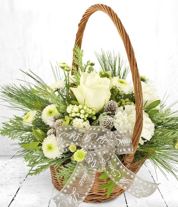 A beautiful basket, brimming with seasonal blooms, and topped off with a festive bow. White roses, carnations and chrysanthemum are complemented by pine cones and luscious seasonal foliage. Created by a local florist and lovingly delivered by hand, this festive arrangement is sure to delight. Please note, the florist will select the finest seasonal stems available, so some contents may vary. ARR17-02