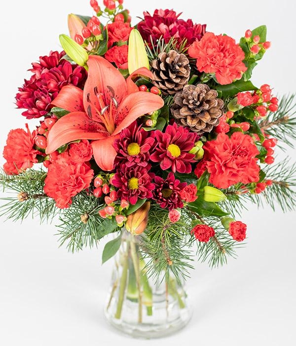 A traditional festive bouquet, bursting with red carnations, red lilies, xanth, pinecones, and fragrant seasonal foliage.
