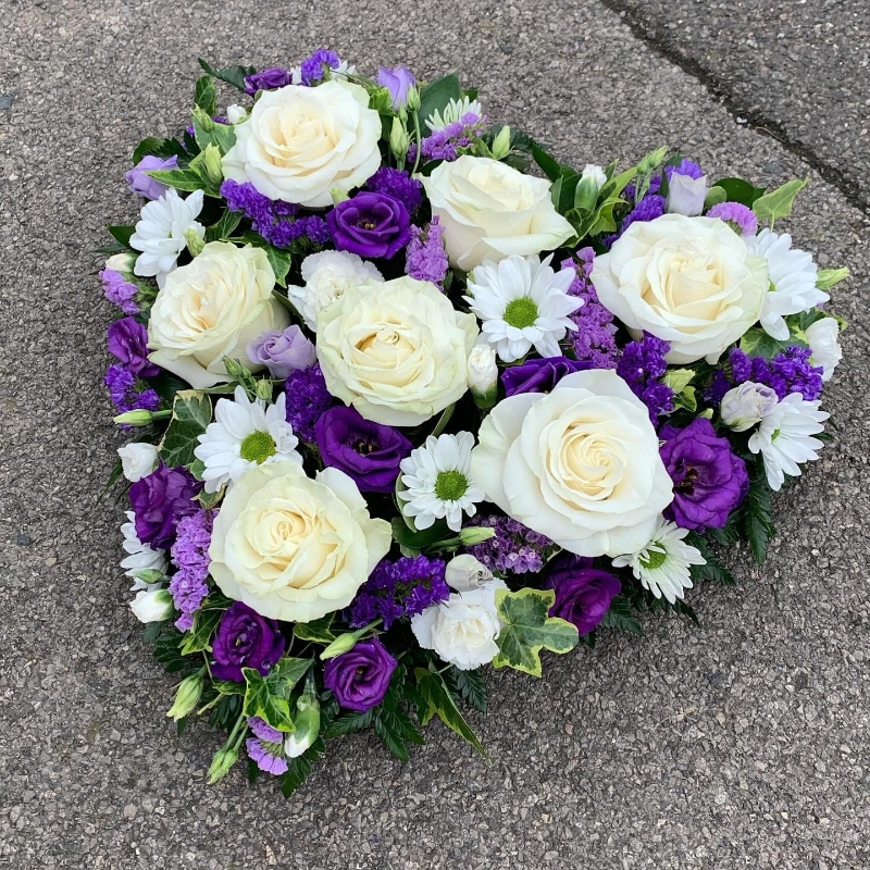 A classic heart shaped funeral arrangement designed to express love, remembrance and sympathy. Featuring roses, delphinium, lisianthus and carnations.