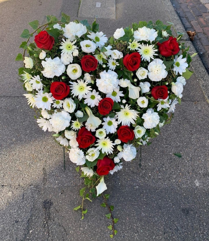 A classic heart shaped funeral arrangement designed to express love, remembrance and sympathy. Featuring roses, callas, lisianthus and carnations.