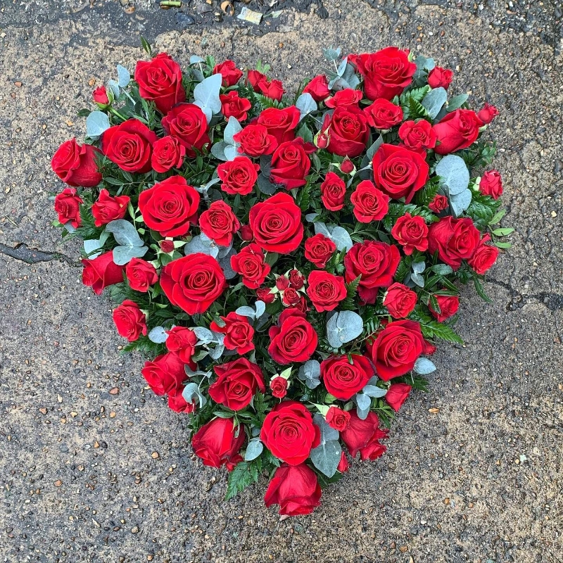 A classic heart shaped funeral arrangement designed to express love, remembrance and sympathy. Featuring beautiful red roses.