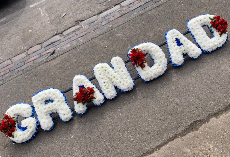 Traditional letter tribute GRANDAD.  Ribbon edge, White based Chrysanthemums with Rose mix top sprays.