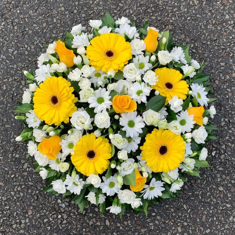 Carefully arranged in a circular design, it's modest size makes it an ideal choice for funerals, memorial services or a heart felt gesture off condolences, offering comfort and grace during a difficult time.